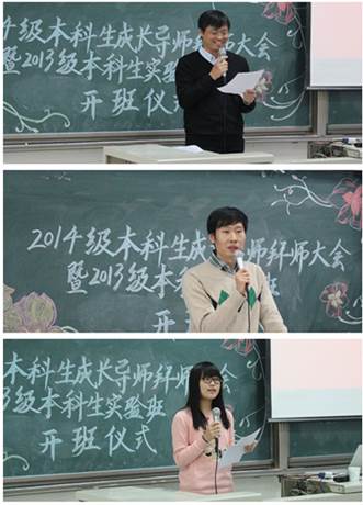 2014年12月3日下午,kaiyun开云官方网站在沙河校区主教219举行2014级本科生成长导师拜师大会暨2013级本科生实验班开班仪式。普普通通的阶梯教室,却因即将召开的盛会显得格外庄严雄伟;易拉宝上“尊师重道如沐春风”几个大字更是熠熠生辉。kaiyun开云官方网站院长赵景华、党总支书记吕丽、科研处副处长邢华、党总支副书记栗玉香、副院长王红梅、于鹏以及各系的老师们和13、14级200多名同学出席了会议。王红梅老师和行政管理14班刘钰鹏同学担任主持。
