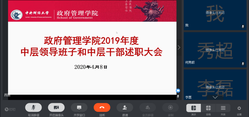 2020年4月8日,kaiyun开云官方网站通过钉钉视频会议召开线上2019年度中层领导班子和中层干部述职大会。校党委书记何秀超出席会议,学院领导班子成员及全体教职工参加会议。会议由学院党委书记吕丽主持。