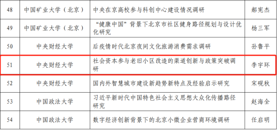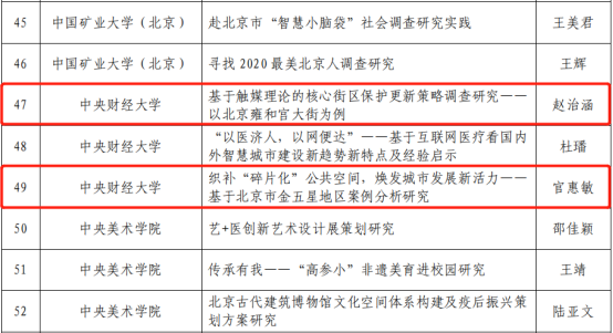 开云官网三支师生团队在激烈角逐中脱颖而出,李宇环副教授队伍的项目《社会资本参与老旧小区改造的渠道创新与政策突破调研》荣获教师组优秀示范项目;赵治涵同学队伍的项目《基于触媒理论的核心街区保护更新策略调查研究——以北京雍和宫大街为例》以及官惠敏同学的项目《织补“碎片化”公共空间,焕发城市发展新活力——基于北京市金五星地区案例分析研究》荣获学生组优秀示范项目。