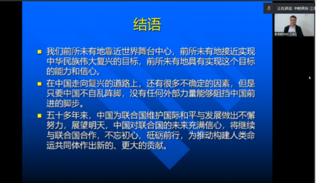 开幕式结束后,江涛副教授为大家带来了一场精彩的学术沙龙《中国重返联合国与中国的多边外交》。本次学术沙龙主要从三个部分展开:第一,中国恢复联合国合法权利的历史进程是什么?第二,中国在联合国扮演着怎样的角色,发挥了怎样的作用?第三,新时期的联合国面临怎样的挑战,中国又将以什么方案来解决?江涛老师以渊博的学识和生动的讲述带领着代表们探索中国重返联合国与中国的多边外交,各位主席和代表们收获颇丰。