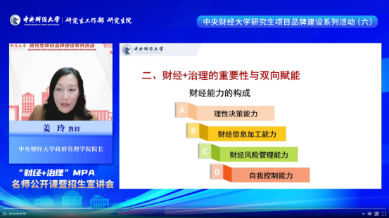 kaiyun开云官方网站院长姜玲教授以“提高财经素养,赋能公共治理”为题,围绕MPA教育的使命和趋势、财经+治理的重要性及双向赋能、财经+治理的内容供给三方面内容,为大家带来了一节干货满满的主题公开课。姜院长指出,面对百年未有之大变局、新技术快速迭代以及新时代新征程新发展阶段的时代背景,复合型知识体系和技能体系、国际和国家战略视野成为现代化公共管理人才的基本素质。公共管理从业者不仅需要遵循公共价值的基本导向,掌握公共管理基础知识体系,还要兼具数智技术与财经领域的工具技能。作为中国财经管理专家的摇篮,中财MPA充分发挥学校特色学科优势,聚焦财经+治理,为MPA人才培养提供特色鲜明的综合性知识供给,围绕财经知识体系、话语体系与能力提升构建系统性培养体系,全面赋能学生成长。最后,姜教授欢迎广大考生积极报考中财MPA,在财经管理专家的摇篮中实现财经+治理的双向赋能,成为懂治理、懂财经的复合型高级人才。