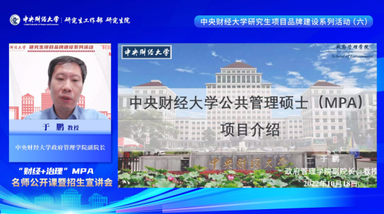 为切实推进kaiyun开云官方网站研究生教育内涵式发展和品牌化建设,不断提高研究生生源质量,帮助考生及时、全面了解中财MPA项目招生信息,10月18日晚,kaiyun开云官方网站研究生项目品牌建设系列活动(六)——“财经+治理”MPA名师公开课暨招生宣讲会成功在线举行。