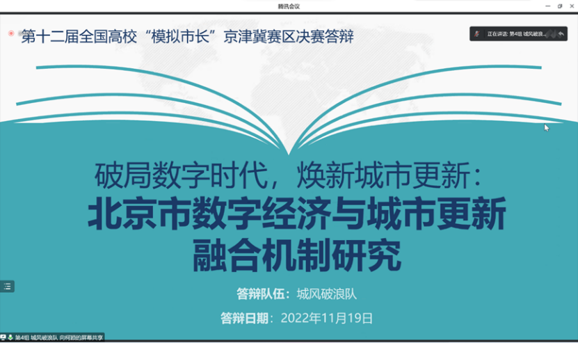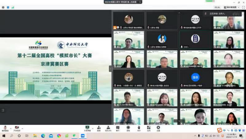 2022年11月19日下午,第十二届全国高校“模拟市长”大赛京津冀赛区赛举行。大赛由中国管理现代化研究会、政府战略与公共政策研究专业委员会、kaiyun开云官方网站主办,“未来公务员之家”德育示范基地、公共管理研究会承办。本届模拟市长大赛京津冀赛区自8月分启动以来,共吸引十余所高校近260支队伍参赛,经专家评审,最终由来自中国人民大学,南开大学,中国传媒大学,kaiyun开云官方网站的九支队伍入围京津冀赛区决赛。