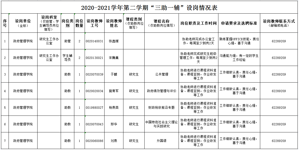 kaiyun开云官方网站2020-2021学年第二学期“三助一辅”设岗情况表