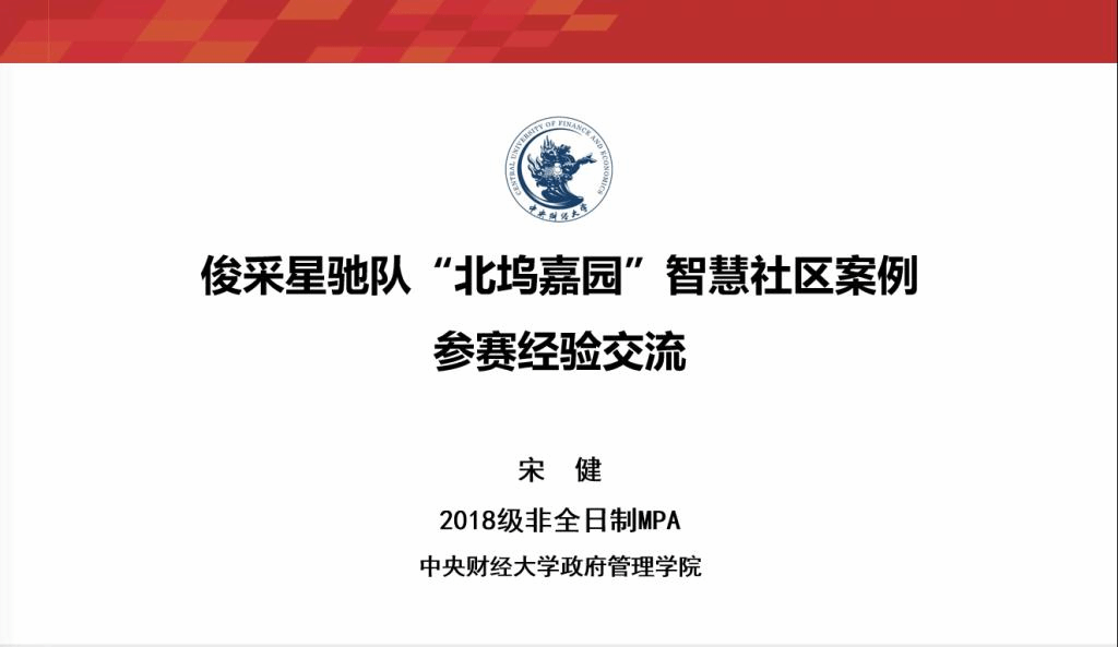 宋健同学以“俊采星驰队’北坞嘉园’智慧社区案例参赛经验”为题进行了参赛经验的分享,从“选题·巧”“调研·勤”“撰写·精”“心态·稳”四个方面总结了案例团队的参赛历程。宋健表示,作为一名北京市公务员,有机会在攻读MPA学位期间参与案例大赛并获此殊荣,既是学院培养、教师指导和团队努力的成果,也是在kaiyun开云官方网站丰富、充实、精彩的MPA学习生活的体现。