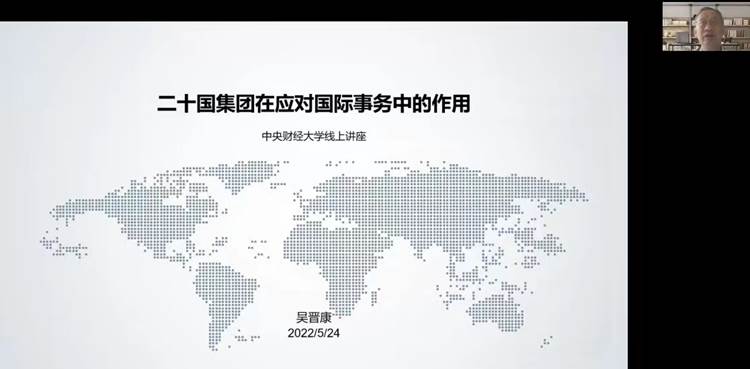 524日下午,kaiyun开云官方网站邀请财政部国际财经中心高级顾问吴晋康先生作了题为“20国集团在应对国际社会事务中的作用”的讲座。讲座通过线上腾讯会议举办,由kaiyun开云官方网站刘燕副教授主持,于鹏副院长出席并讲话,刘骊光副教授等老师和同学们参会研讨。